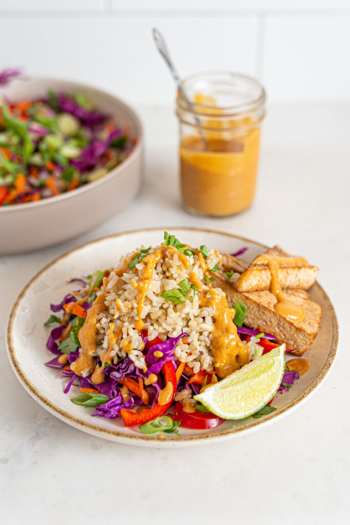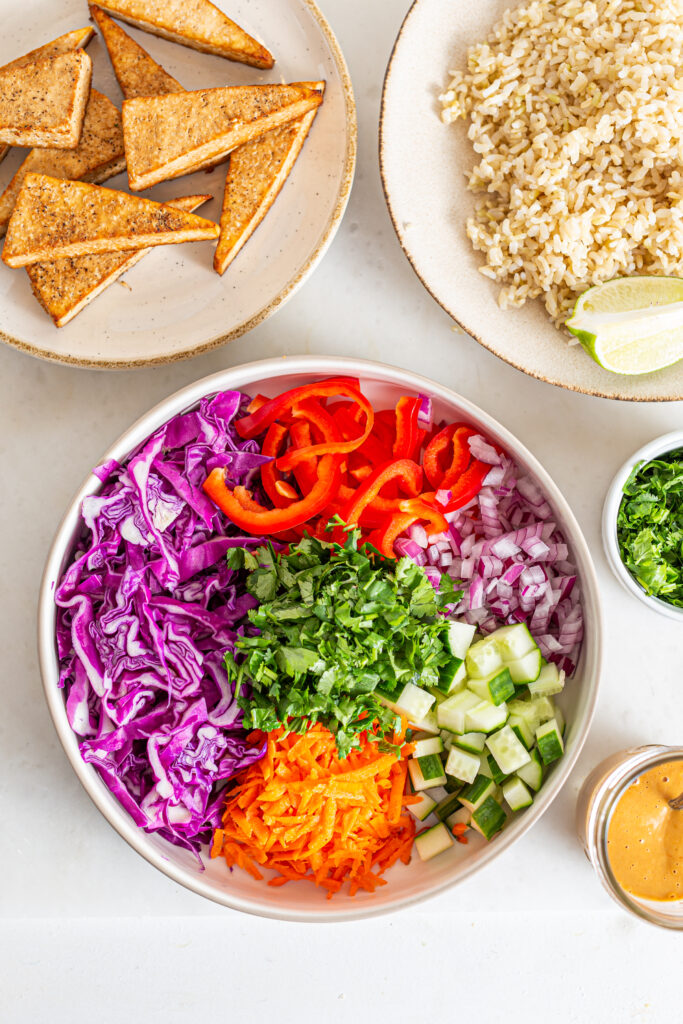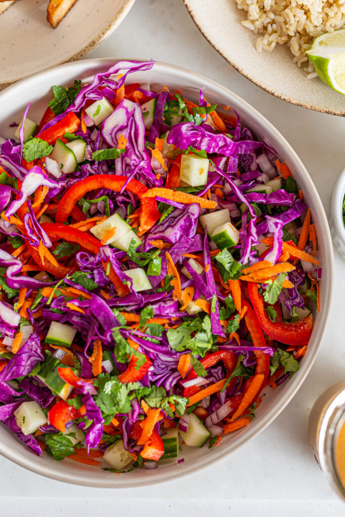 chopped Thai salad, Thai peanut salad, vegan Thai salad, Thai salad with peanut dressing, crunchy cabbage salad, Asian chopped salad, tofu salad recipe, baked tofu salad, healthy vegan salad, plant-based lunch ideas, dairy-free salad recipe, gluten-free Thai salad (with tamari), fresh vegetable salad, meal prep salad, easy weeknight salad, colorful salad bowl, peanut dressing recipe, homemade peanut sauce, cabbage carrot salad, brown rice salad bowl, light dinner ideas, Orthodox fasting recipes, fasting-friendly meals, vegan protein salad, clean eating salad, wholesome vegan recipes