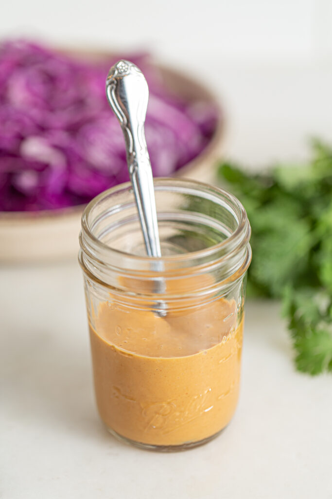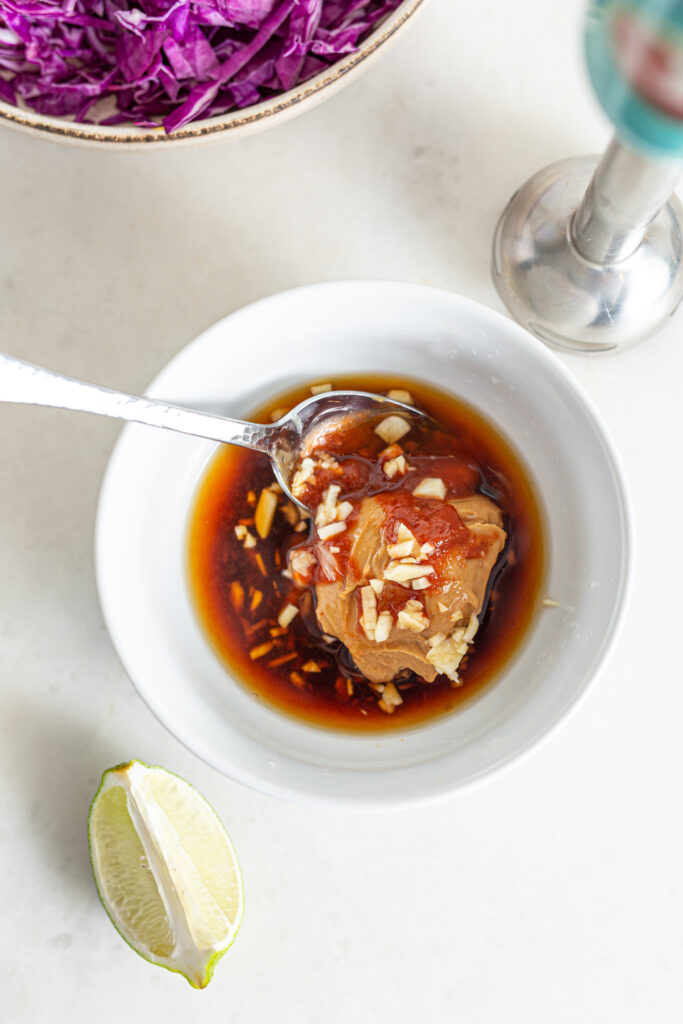 Whisk together peanut butter, soy sauce, lime juice, maple syrup, sriracha, and garlic. Add warm water a little at a time until smooth and pourable.