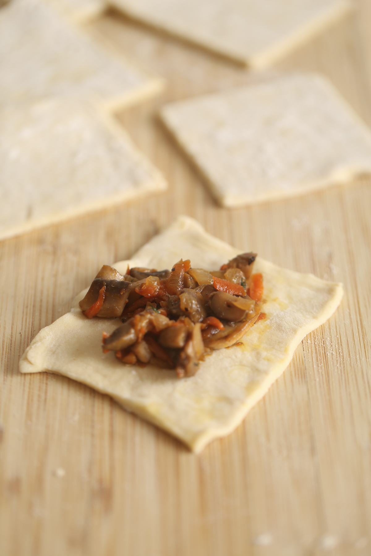 Place 1–2 tablespoons of mushroom filling in the center of each square.