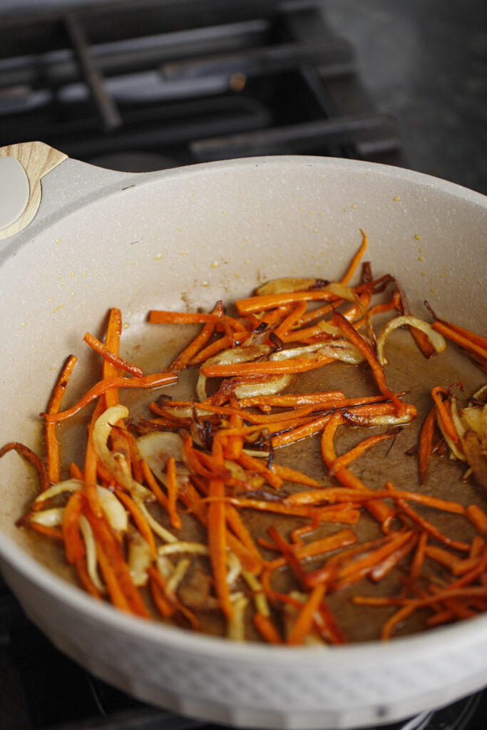 Heat olive oil in a wide skillet or sauté pan over medium heat. Add the sliced onions and julienned carrots. Cook for about 5–7 minutes, stirring occasionally, until the vegetables soften and begin to caramelize.
